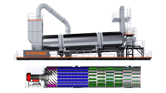 | 再生干燥滾筒 滾筒加熱方式采用火焰輻射熱和煙氣熱交換組合方式進(jìn)行加熱,充分利用熱量,降低燃油成本。 滾簡采用專利防粘技術(shù),內(nèi)部葉片獨(dú)特布置,采用把式結(jié)構(gòu)+擺動鏈條+錯落布置+長滾筒結(jié)構(gòu),保證再生滾簡形成良好料簾,提高熱效率。擺動鏈條防止再生料黏附。 減速電機(jī)直聯(lián)驅(qū)動,驅(qū)動高效。 出料端設(shè)有紅外線測溫裝置。  |