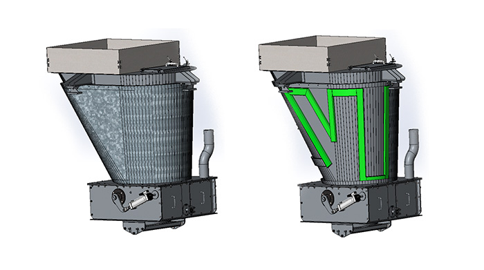 | 再生熱料倉 熱料倉采用大倉容的結(jié)構(gòu),大角度倉壁,倉壁設(shè)有導(dǎo)熱油加熱裝置,保證再生料卸料流暢,不黏附。 熱料倉采用大小門結(jié)構(gòu),具有粗精稱功能。  |
